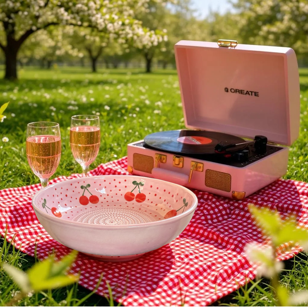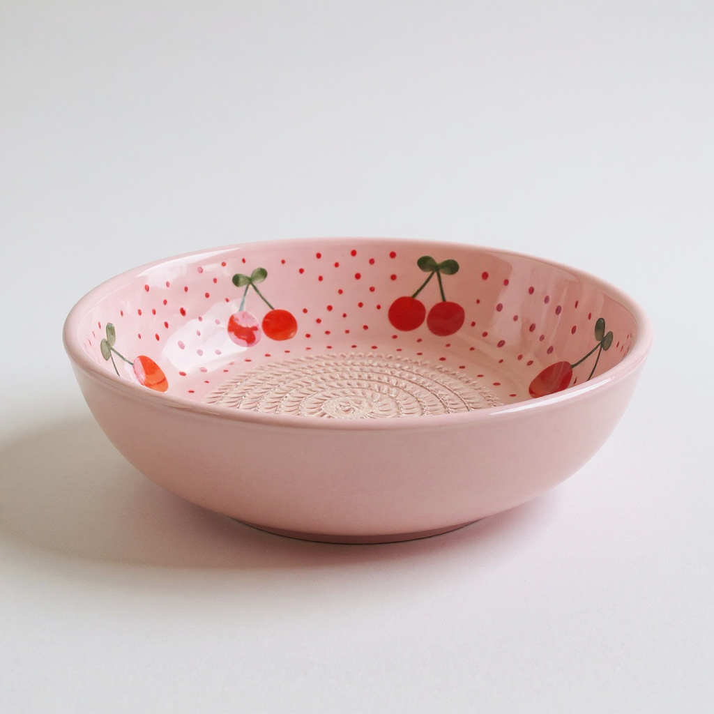 Un diseño dulce y alegre que lleva la frescura de las cerezas directamente a tu mesa. Este plato rallador está hecho y pintado a mano, lo que lo convierte en una pieza única e irrepetible. Con su fondo rosado decorado con pequeños lunares y ramas de cerezas, combina funcionalidad y encanto artesanal.