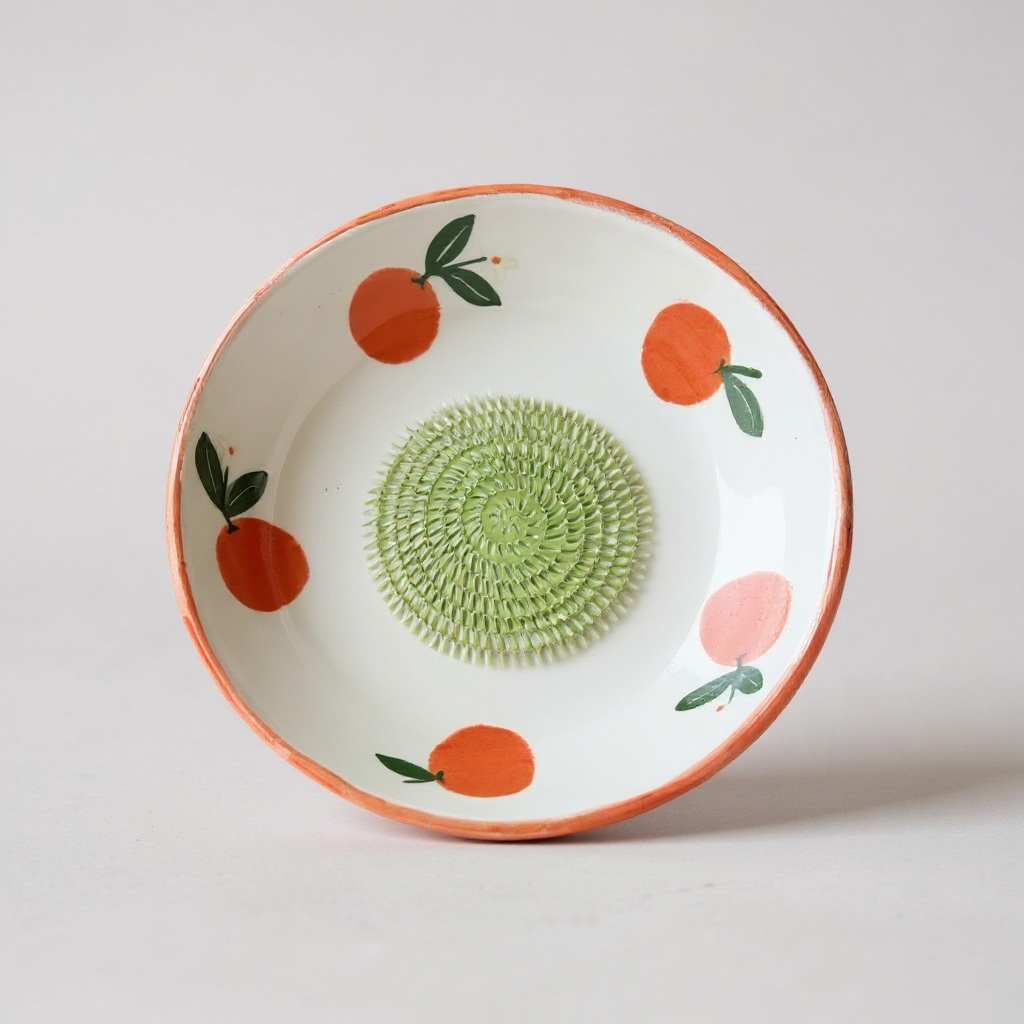 Este hermoso plato rallador de cerámica pintado a mano combina arte y funcionalidad en una sola pieza. Con un diseño artesanal y una superficie texturizada en el centro, es ideal para rallar ajo, jengibre, nuez moscada, chocolate, quesos duros y más, de forma rápida y sin necesidad de utensilios metálicos.